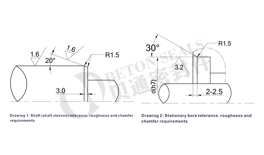 (2)The end of shaft (or shaft sleeve )be installed mechanical seals rotary, the end of bore for installing mechanical seals stationary seat,chamfer, roughness, tolerance should accord with drawing 1 and drawing 2.
